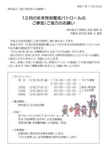 2025年11月14日 / 最終更新日時 : 2025年11月14日 nishinakanobutokyo 防犯部 年末特別警戒 年末特別警戒のお知らせ 一緒にご参加頂ける方はよろしくお願いします。 FacebookXBlueskyCopy
